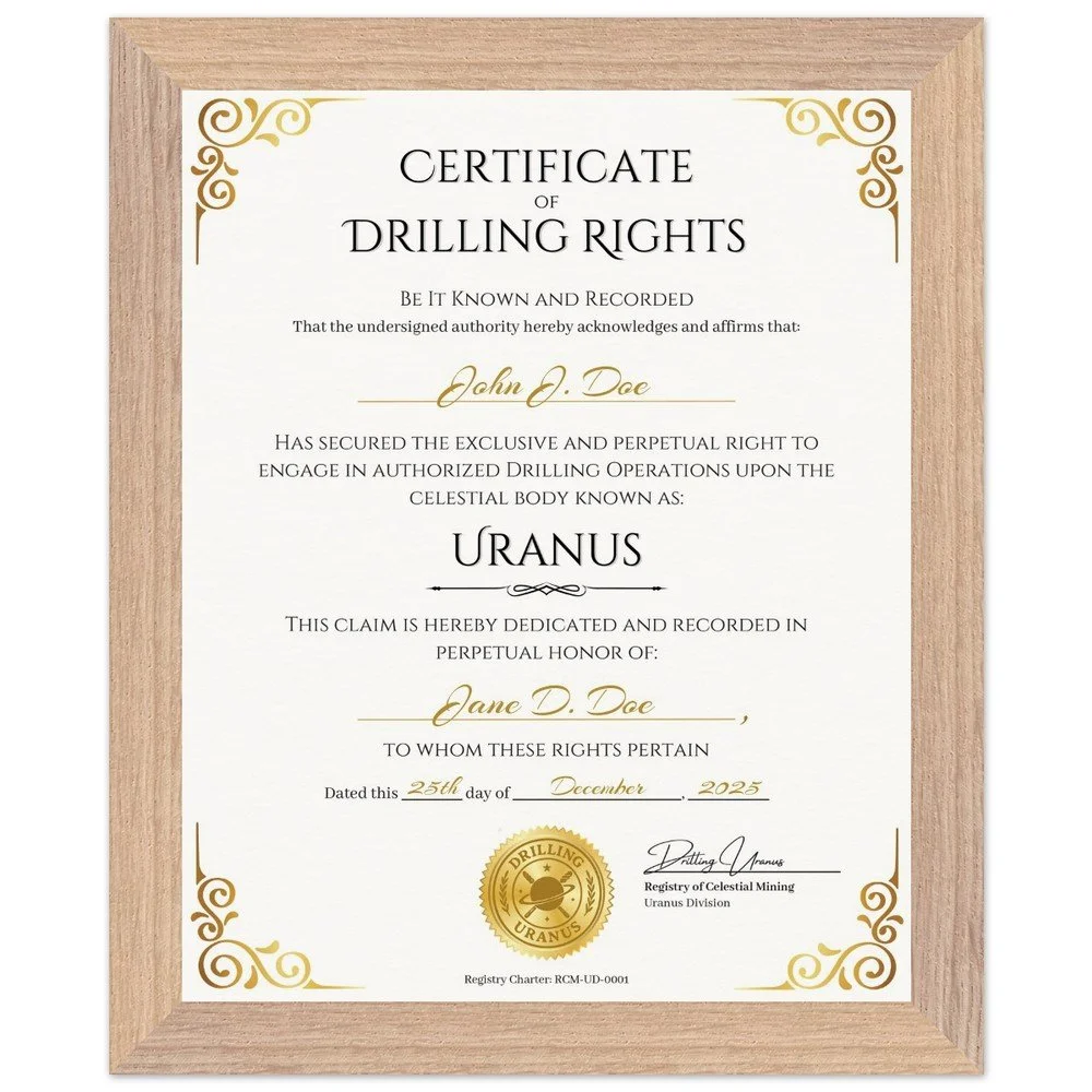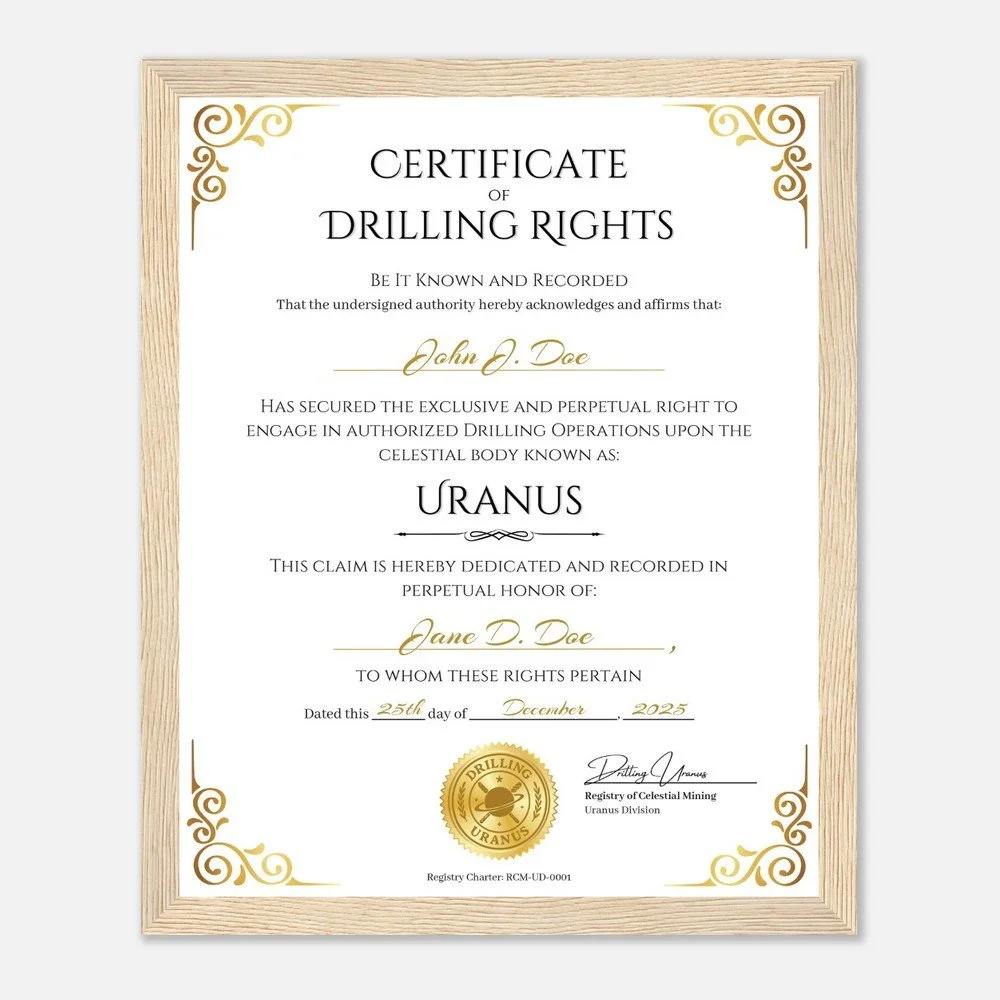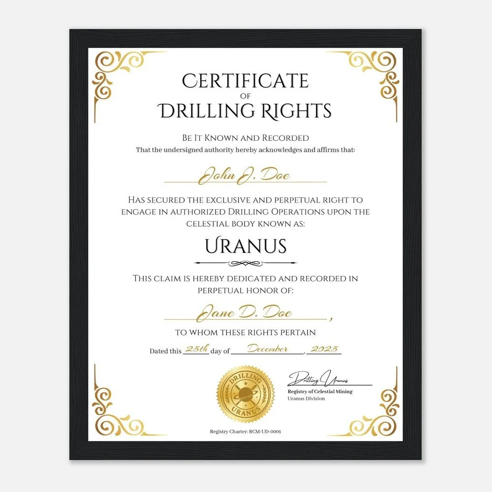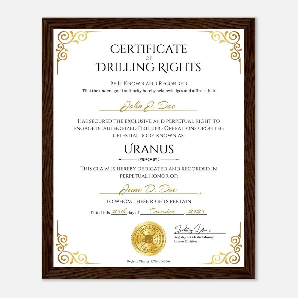 Registry of Celestial Mining:Uranus Division Drilling Rights to Uranus (Framed, Premium Wood + Museum-Quality Matte) Sale Price: $49.99 Original Price: $69.99 Sale Drilling Rights to Uranus (Framed, Premium Matte) Sale Price: $36.99 Original Price: $46.99 Sale Feedback From Deep Space “Best gag gift ever, my buddy hung it in his office and HR still talks about it. 10/10.” Mike R. “Gave this to my man for his birthday. We laughed for days. Beautiful print. Fast shipping.” Jamie K. “Ordered on a whim, arrived framed, instant centerpiece of our living room. Hilarious.” Ethan G. “Perfect for fantasy football trash talk, my league can’t stop mentioning it. Quality is legit.” Keith F. “Gifted it to my roommate, he thought it was real at first and then laughed so hard he cried.” Olivia K.
