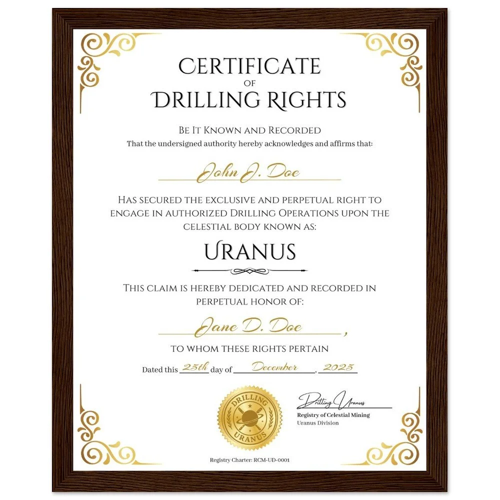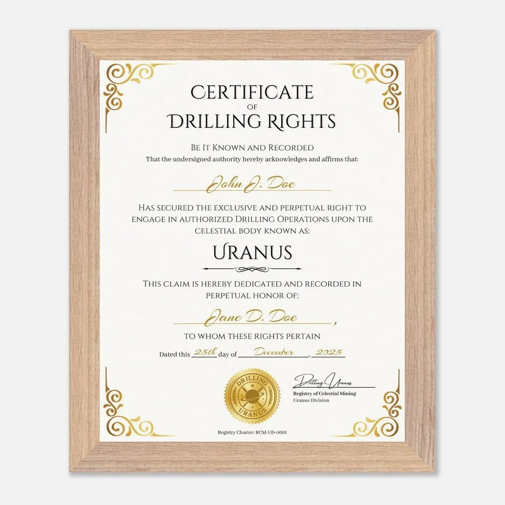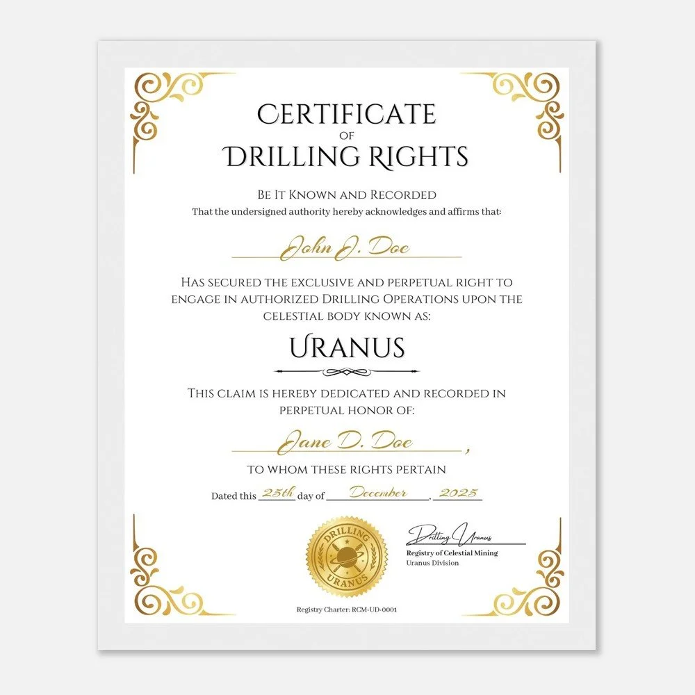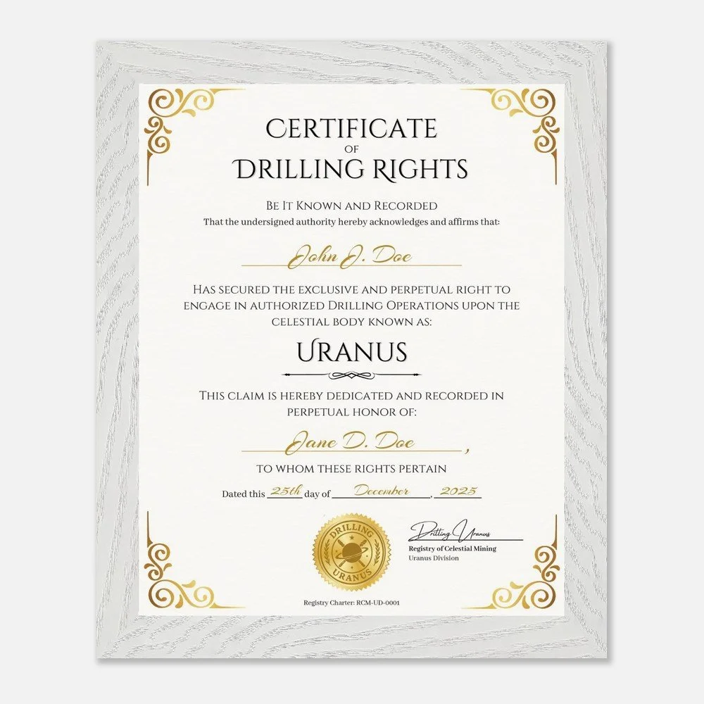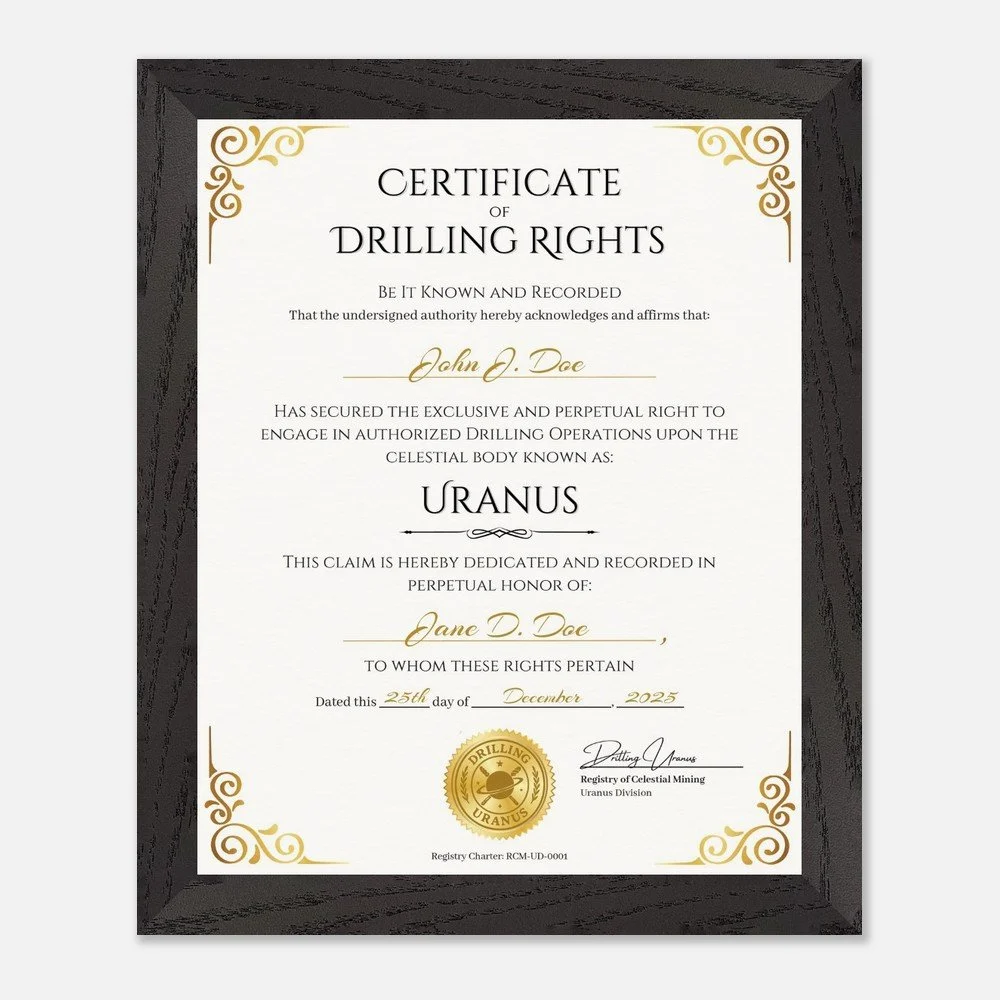 Registry of Celestial Mining:Uranus Division Drilling Rights to Uranus (Framed, Premium Wood + Museum-Quality Matte) Sale Price: $49.99 Original Price: $69.99 Sale Drilling Rights to Uranus (Framed, Premium Matte) Sale Price: $36.99 Original Price: $46.99 Sale Feedback From Deep Space “Best gag gift ever, my buddy hung it in his office and HR still talks about it. 10/10.” Mike R. “Gave this to my man for his birthday. We laughed for days. Beautiful print. Fast shipping.” Jamie K. “Ordered on a whim, arrived framed, instant centerpiece of our living room. Hilarious.” Ethan G. “Perfect for fantasy football trash talk, my league can’t stop mentioning it. Quality is legit.” Keith F. “Gifted it to my roommate, he thought it was real at first and then laughed so hard he cried.” Olivia K.